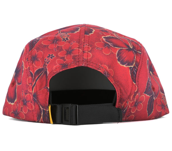 The camp cap from Stussy features embroidered metallic branding over a floral print cotton.
