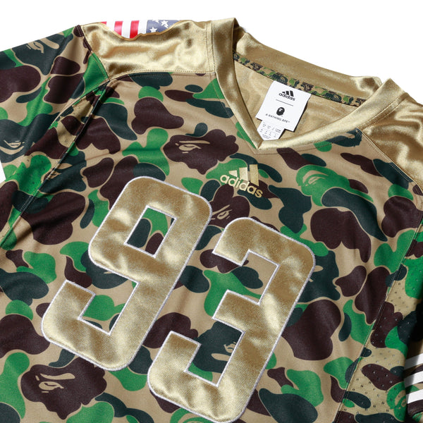 Just as the Giants disrupted the Bills’ K-Gun offense in Super Bowl XXV with their unorthodox, two man defensive line, Adidas and BAPE are playing it anything but conservative on this gridiron collaboration. That means, instead of the usual streetwear basics, the iconic BAPE camouflage pattern has been applied to a range of performance football gear: cleats, tech hoodies, jerseys, compression tights, and sleeves, gloves, even a helmet and regulation size ball.