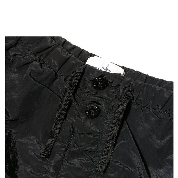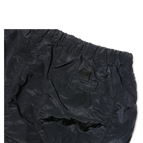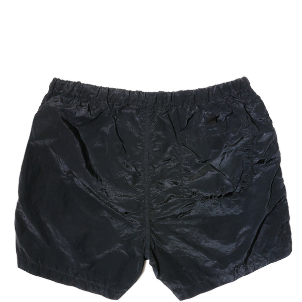 Swimming shorts in Nylon Metal. The trilobal structure of the nylon yarn, with its Nylon Metal gray weft and white ready to dye warp colors, forms the background of its metallic sheen, which is enriched with iridescent shading thanks to the garment dyeing.