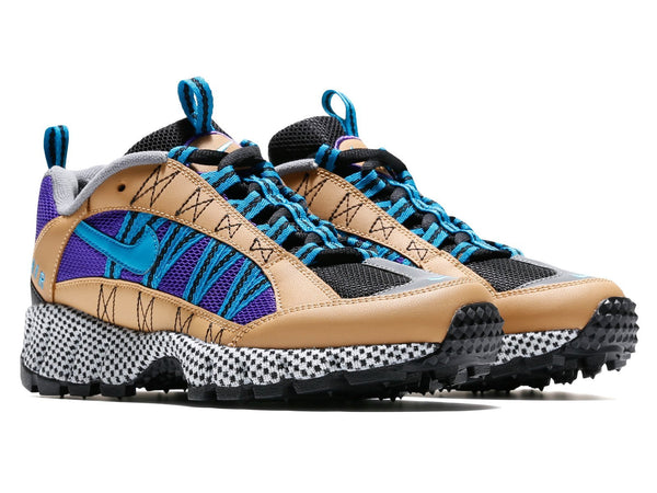 The latest Air Humara variant, the ‘Elemental Gold,’ utilizes the quintessential 90s color combo, teal and purple. Joined by natural, tan leather overlays, black at the tongue and toebox, and a black and white dotted midsole, for a mash-up vibe that perfectly compliments the mix of technical performance and forward thinking style that define Nike’s outdoor offerings.