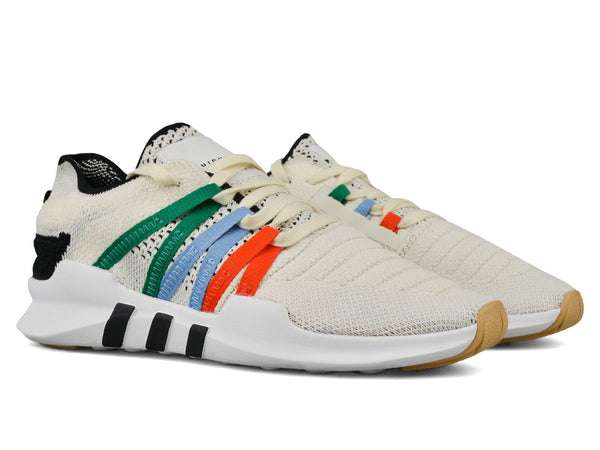 A Primeknit upper, off white colorway, and the multicolored nylon webbing that doubles as three stripes an an external lace support system set the pace for this chic, contemporary take on a classic Adidas performance runner.