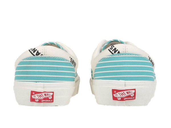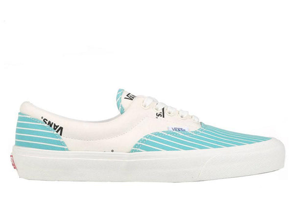 Vans offers up the Era draped in a canvas that features an all-over branded print across the mid-section while the heel, toe, and piping come in a striped turquoise.