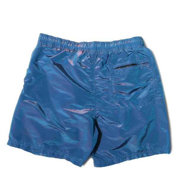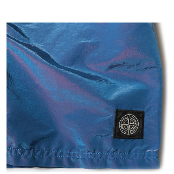 Swimming shorts in Nylon Metal. The trilobate structure of the nylon yarn, with its gray weft and white ready-to-dye warp colors, is the grounds of the distinctive metallic and tonic sheen of Nylon Metal, one of the most versatile fabrics born of Stone Island textile research. Garment dyed with double dyeing recipe.