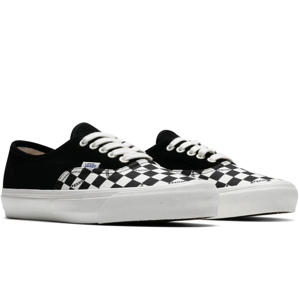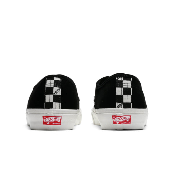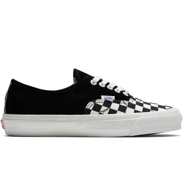 The classic, Authentic silhouette mixes two signature motifs from Vans' classic catalog, the iconic checkerboard pattern and solid color blocking. A solid, suede upper is paired with a checkerboard, canvas vamp and heel tab, with Vans text branding inside individual checkerboard squares adding an extra, classic, off the wall element.