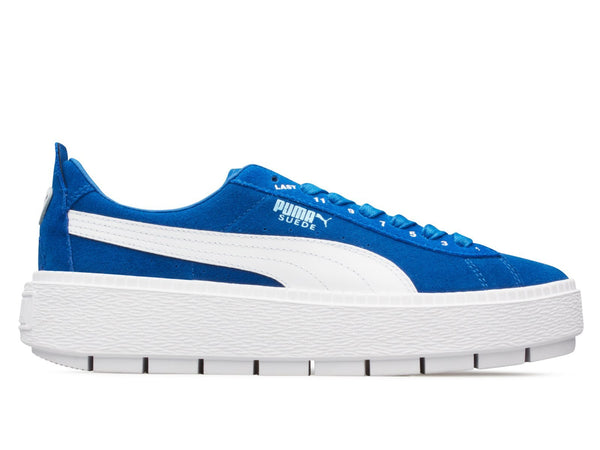 The playfully conceptual take on what is arguably the ultimate Puma classic, the Suede, combines a buoyant, athletic, blue and white colorway with an outsized, platform sole, and artistic flourishes like collage detailing, text and iridescent branding.