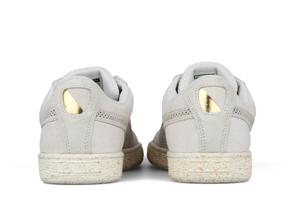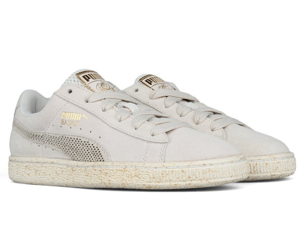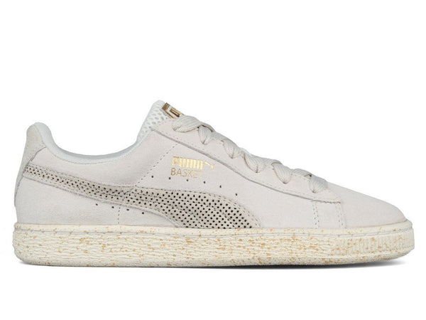The instantly recognizable Puma Basket is worked over with a fine brush. Subtle touches like a perforated leather form stripe, speckled midsole, and metallic gold cat’s eye heels compliment the clean lines of an off-white colorway.