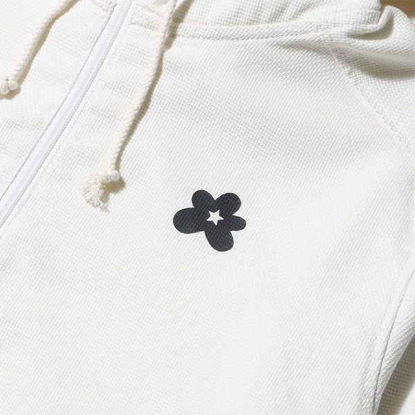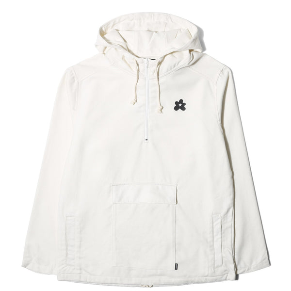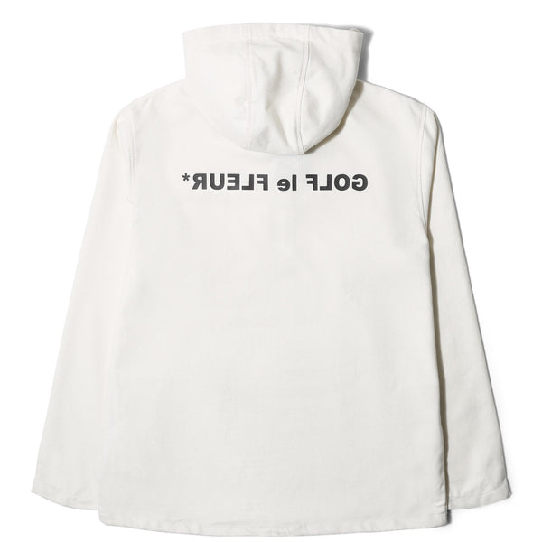 An apparel component, a hooded, pullover anorak compliments the subdued aesthetic of the footwear, as open weave fabric in curry and natural colors features a quarter-zip, a single, central flap pocket, and subtle Golf Le Fleur branding at the chest and back.