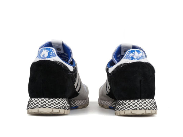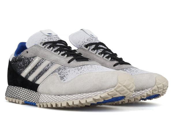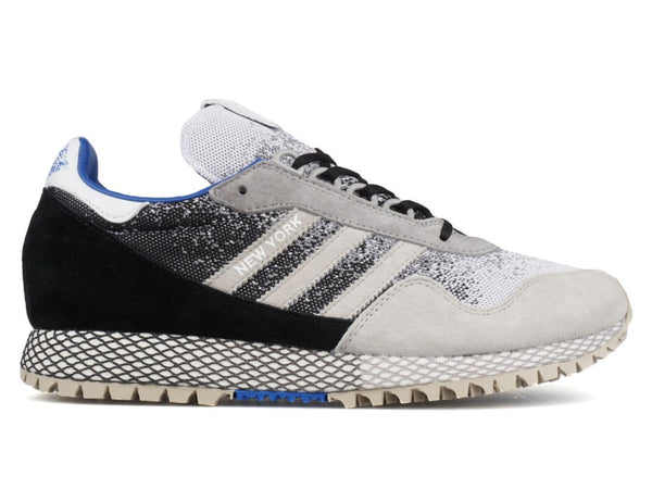 So no surprises that the latest Adidas Consortium release from Hanon takes on the majestic, space shuttle shaped, Dellinger web adorned New York. Sporting a woven jacquard upper in a white, grey, and black, light to dark gradient pattern, dubbed ‘dark storm.’ Hanon’s New York is a tribute to the temperamental and often inclement weather in northern Scotland. The stark palette is broken up by Adidas Originals blue accents, which serve as a homage to the original New York and an optimistic reminder that blue skies are bound to appear, even after the greyest days.
