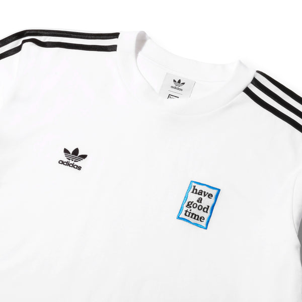 Adidas and Have A Good Time follow up this past fall’s collaborative effort with a new capsule collection for Spring/Summer ’19. While the previous collection emphasized timeless basics from the three stripes archive, for their second go-round, the two brands have zeroed in on a late 1980s/early 1990s casual aesthetic, adding a knit, graphic crewneck featuring the Adidas trefoil on the front and Have A Good Time’s box logo on the back, a color blocked, half-zip, hooded pullover with, and circa 1991 over the shoulder Equipment stripes soccer jersey to the tracksuit and t-shirt foundation.