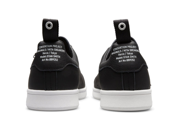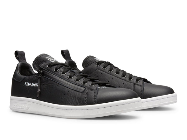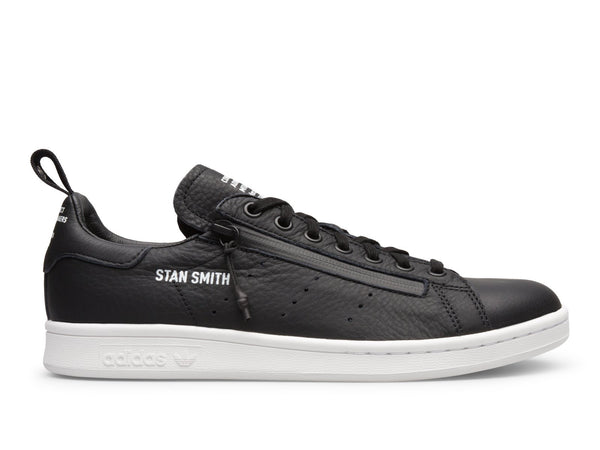 The Stan Smith has a basic black leather and white sole base, augmented by an ankle to toe side zipper, and subtle text branding.